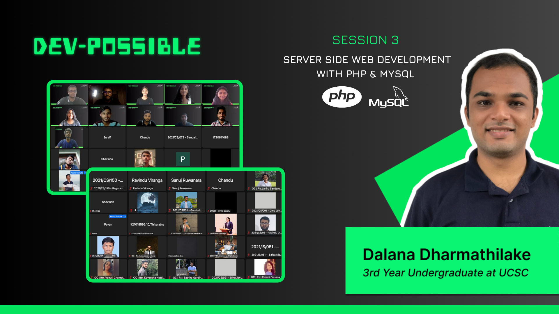 After the second session on front-end web development, the Dev-possible series transitioned into divulging the inner workings of back-end web development through its third session. Dalana Dharmathilaka who is a 3rd year undergraduate at the University of Colombo School of Computing and a Software Engineer at AI Team, delivered this session on Server-side Web Development using PHP and MySQL. This final session of the series was successfully conducted on the 28th of August, 2022 which also marked the conclusion of Dev-possible 2022.