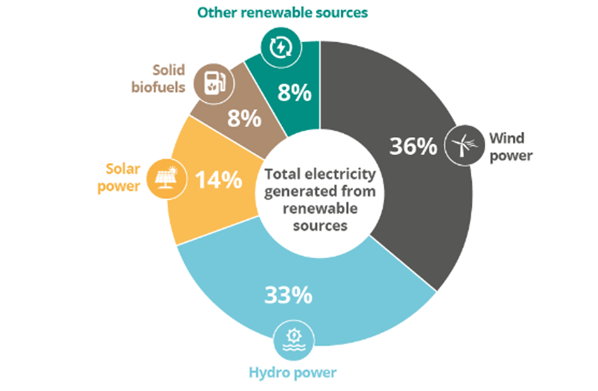 Wind and hydro power accounted for more than two thirds of the renewable energy produced in the EU in 2020, according to Eurostat statistics (36% and 33%, respectively). The remaining third was comprised of solar energy (14%), solid biofuels (8%), and other renewable sources (8%).